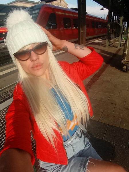 Meine Haare sind echt. Ich trage keine Perücken, bin aber auch keine natürliche Blondine. Ich füge ein Foto bei, damit ihr euch nicht wundert, wenn meine Haare wieder gewachsen sind. Außerdem füge ich ein Selfie bei, um meine echten Augen zu sehen. Mit schminken und natürliche Gesicht